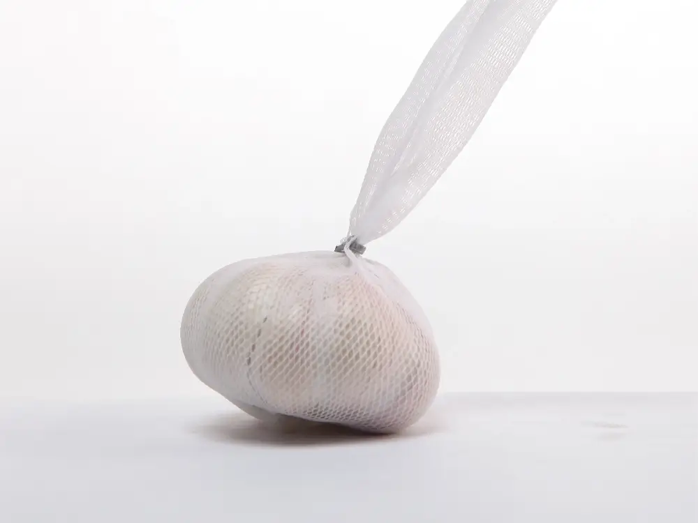 Garlic packaged in small mesh bags is suitable for sale in supermarkets. Each bag of garlic weighs 1 kg.